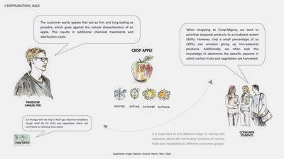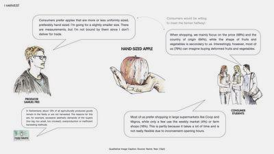 Food waste already starts in the field. 13 % are not harvested or are sorted out because they do not meet the high quality standards of the Swiss market. The consumption behaviour of Zurich residents has a direct impact on the agricultural output in Zurich North. To foster meaningful change, consumers need to rethink their diets and buying habits.The standardisation imposed on vegetables and fruits often results in significant food waste or forces farmers to find alternative uses, such as transforming misshapen apples into cider. Unfortunately, many of these imperfect products are still getting disposed off. Intriguingly, our survey data reveals that 76 % of individuals would be open to purchasing deformed vegetables and fruits. This prompts the question: why persist in current practices when consumer preferences lean towards embracing a more inclusive approach to agricultural produce?