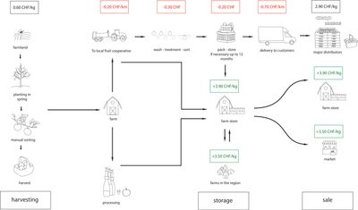 The apple for the apple crumble cake at the family dinner has a long way to go before it reaches the plate.The supply chain starts at the very beginning in the field. The trees planted in spring grow. The apples grow. Beautiful round shiny apples, but among them also deformed and unattractive.The deformed and non-standard products are sorted out. The beautiful ripe ones are picked and brought to the local fruit facility. They are sorted, washed and treated, then packed and stored. From there they are further distributed to wholesalers like Coop and Migros or it goes back to the origin, back to the farm store. From the farm store they are sold partly to the surrounding farmers or partly on the market. The market, wholesaler or farm store is the final destination of an apple. This is where consumers come in. From these points they get their purchase for their home.